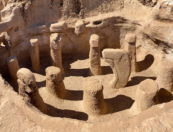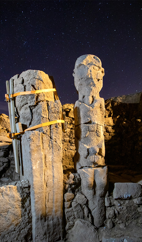 Göbeklitepe’de yapıları gömülmesi ile koruma altına alınan yapı öğelerinin başında T biçimli dikilitaşlar gelir. Kol, el gibi uzuvların anatomik konum ve orantısı gözetilerek kabartma halinde işlenmiş olmaları, dikilitaşların insanın sembolize ettiğini düşündürür. Dikilitaşlar aynı zamanda tarih öncesi ‘anlatıcılar’ için adeta bir ‘yazı tahtası’ olarak kullanılmışlardır; hayvanlar, geometrik motifler ve insan betimleri ‘hikayelerin’ karakterleridir. Sembollere dönüşmüş bu karakterler bazı ortak özelliklere sahiptir, bu da onlara yüklenen anlamları bilinir olduğunu akla getirir. Sembollerin yanı sıra bir araya getirilerek oluşturdukları sahneler anlatılmak istenenin kimi zama görünenden daha fazlası olduğuna işaret eder. Sembollerdeki hayvanların çoğuna ait kemiklerin kazılarda bulunmuş olması da sahneyi oluşturan canlılar ile oları yapan insanların aynın ortamı paylaştığının kanıtıdır. Kuşkusuz bu sembollerin doğaüstü varlıklara atfedilmiş olmaları da mümkündür.